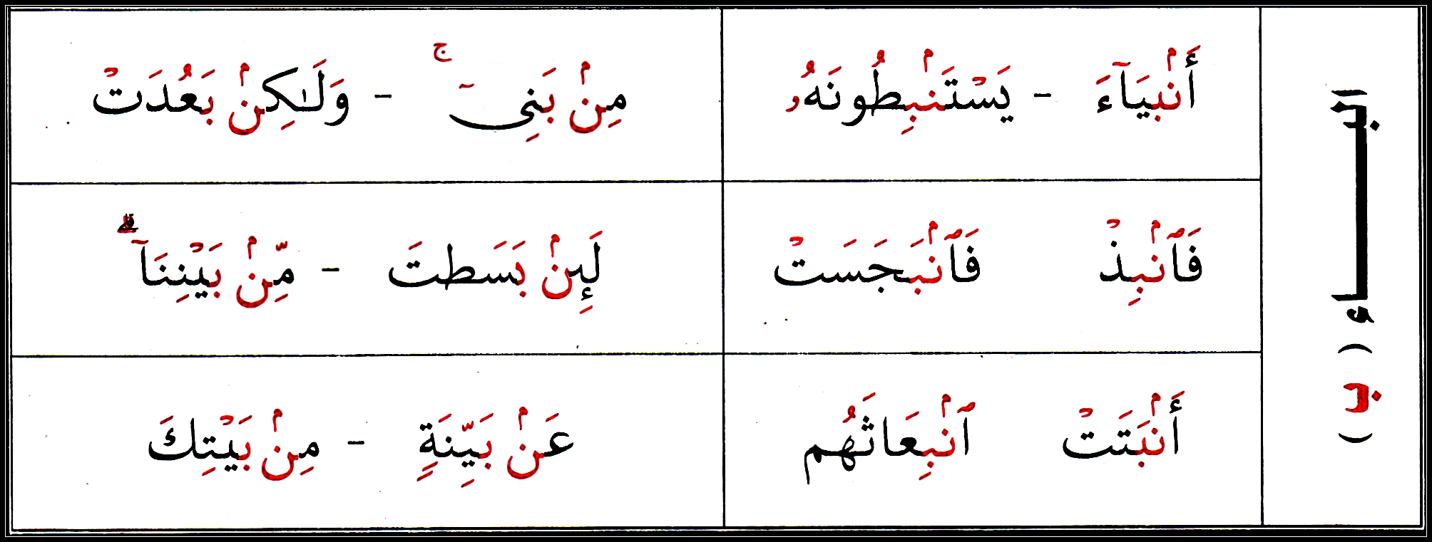 The rule: If any of the 15 letters of Ikhfaa’ come after Noon As-Sakinah or Tanween the word will be read with Ikhfaa’ and the sound is considered to be between Ith’har and Idghaam with the existence of Ghunna, and the duration will be of two Harakah.